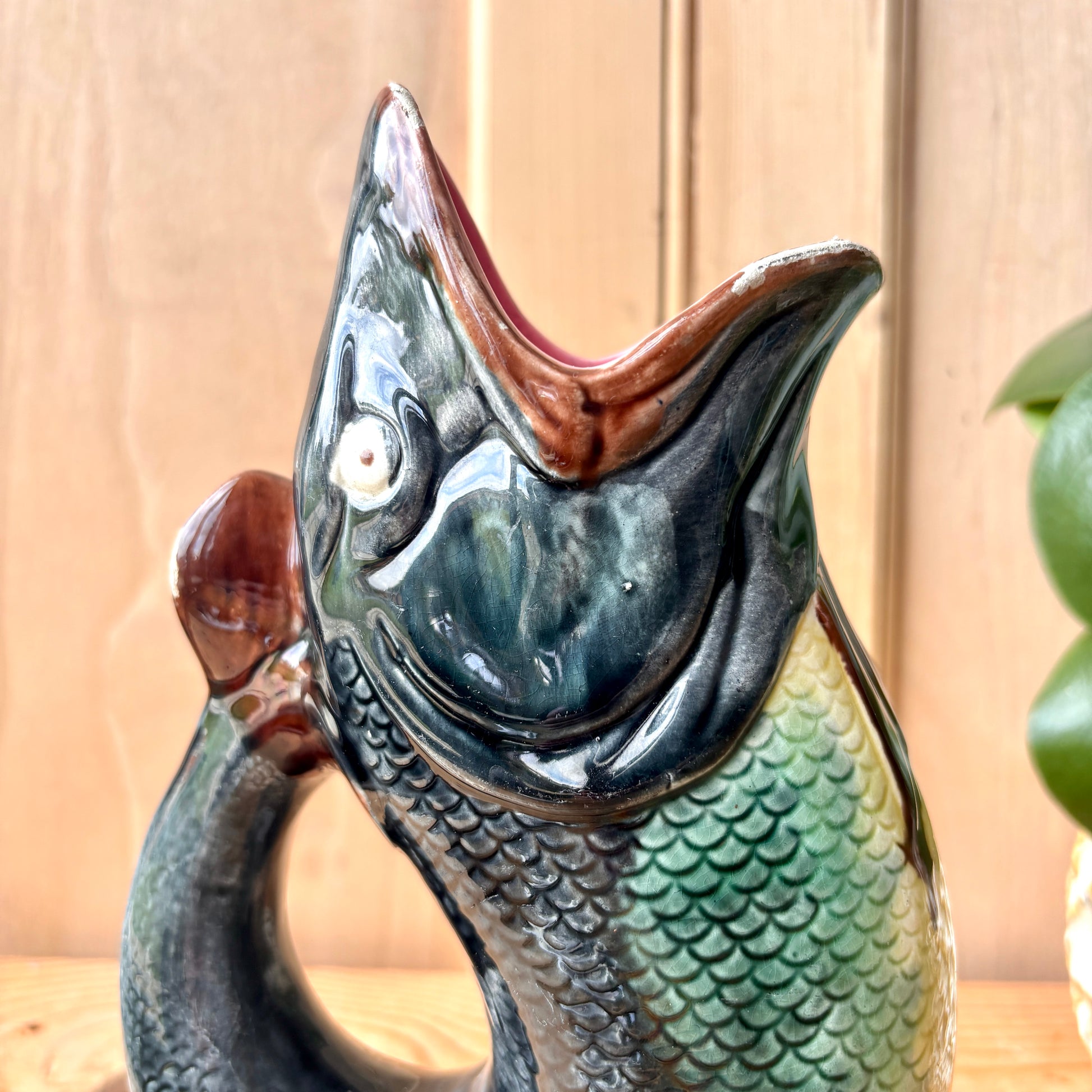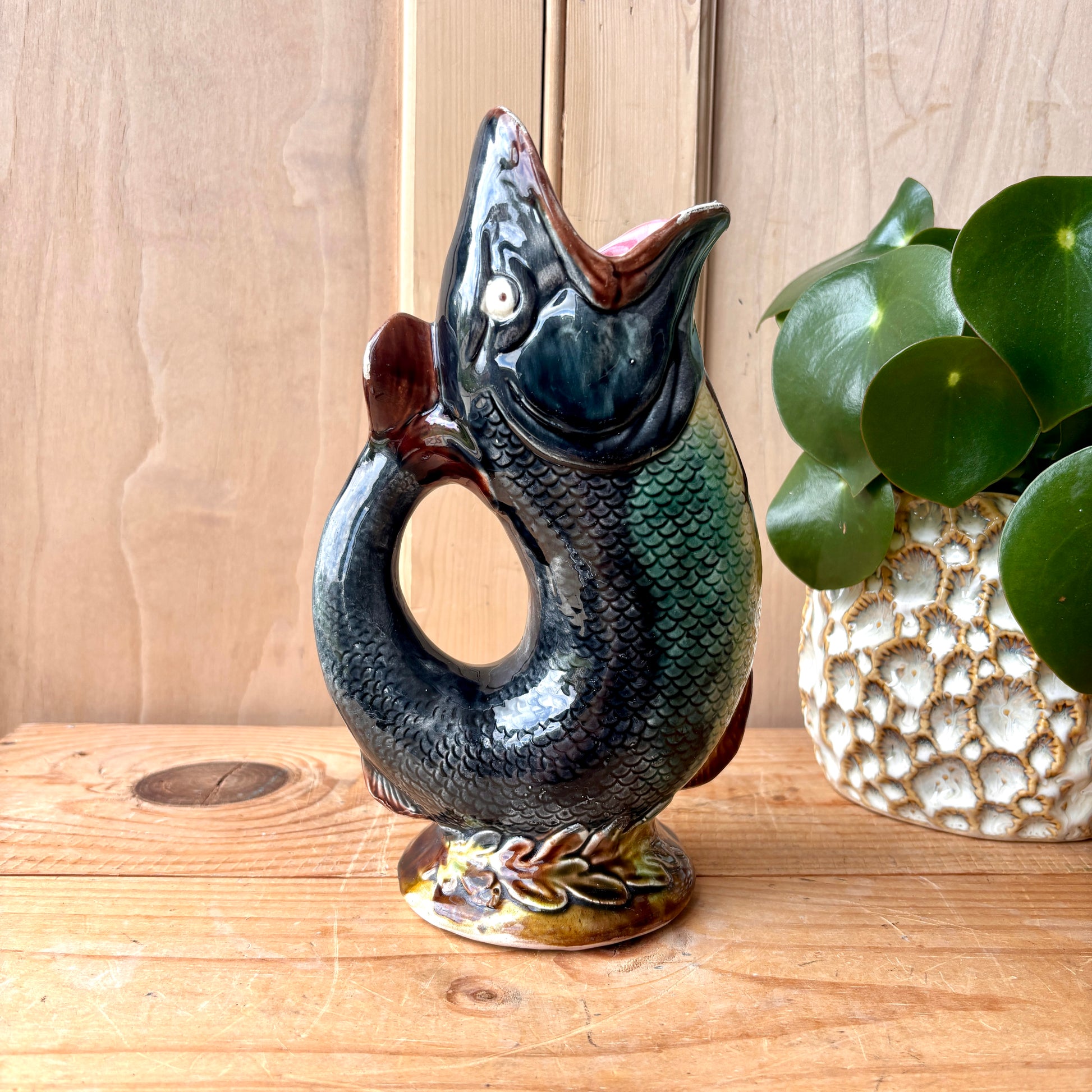 This gorgeous antique Majolica Fish Gurgle Jug Vase dates back to the late 1800s. The Fish Shaped vase is variously named as a Gluggle, Bubble or Glug Jug although most call it a Gurgle Jug. So called because the fish jug features a unique shape that makes a glugging sound when you pour liquid from the fish’s open mouth. The fish’s moulded features such as it scales, head and fins are clearly visible.