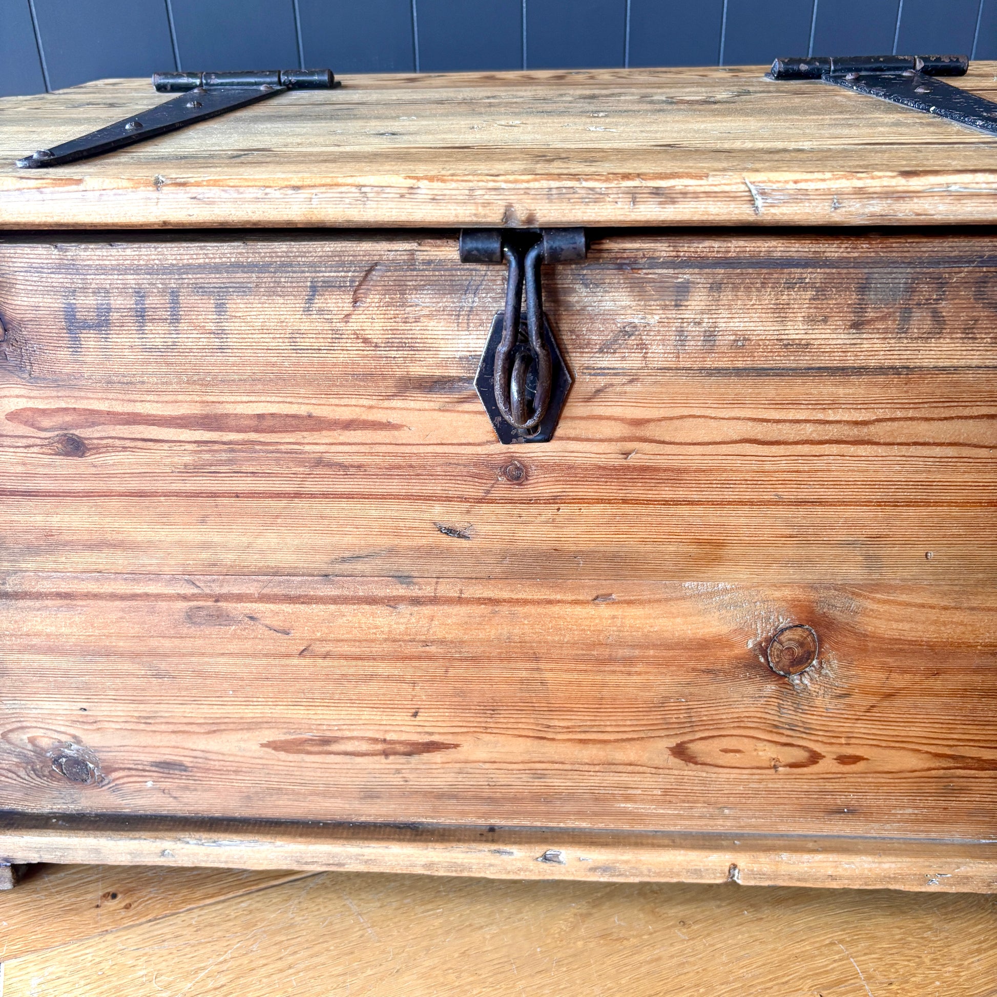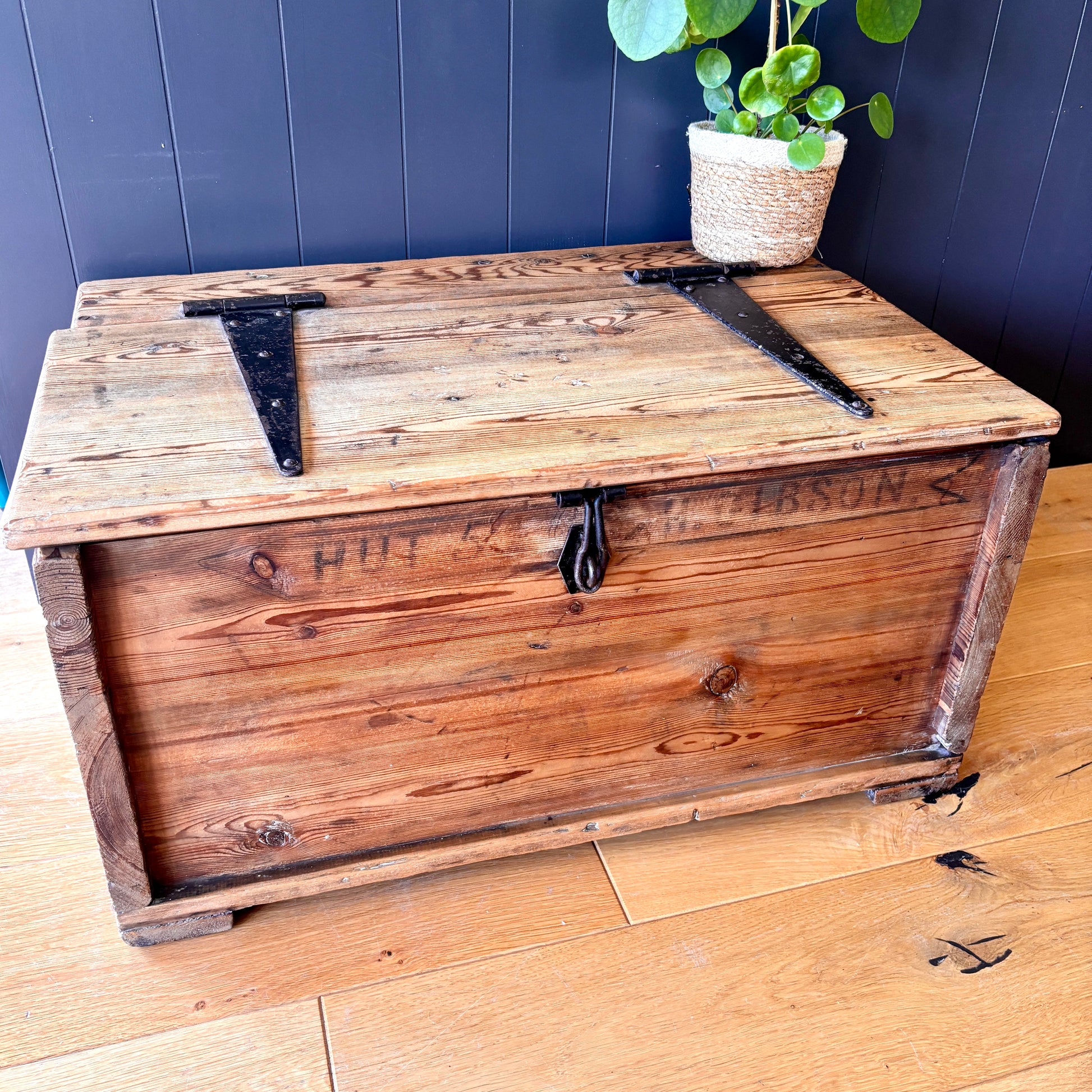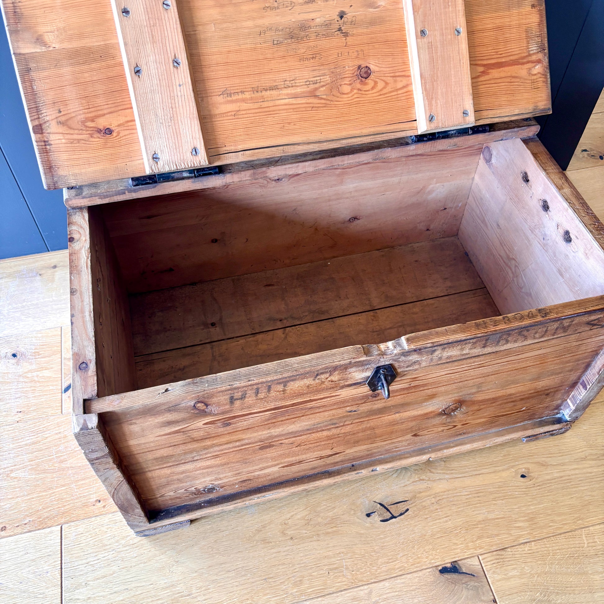 This beautiful wooden foot locker dating back from the early 1930s. Made of pitch pine and would have been used as a foot locker in an Army basic training camp. The markings of the hut it was in including some of the soldiers that used it as still clear to read on the inside.