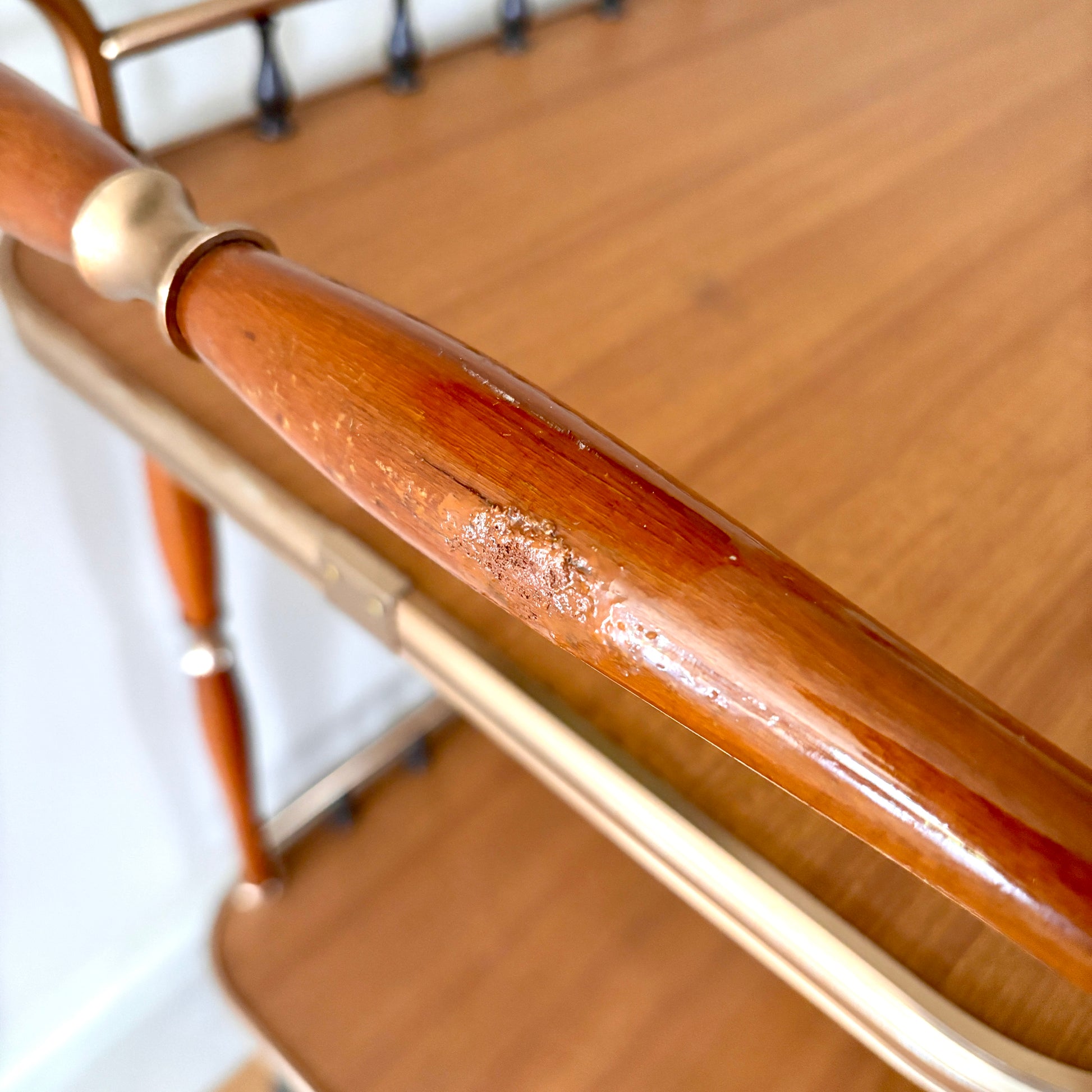 Condition: the trolley is in great vintage condition with some marks to the legs and handles (please see all the images) with the most noticeable damage being to one of the handles which has been leaned on and bent down at the brass upright, this is shown in the images and the price does reflect this. The trolley is still fully functionable.