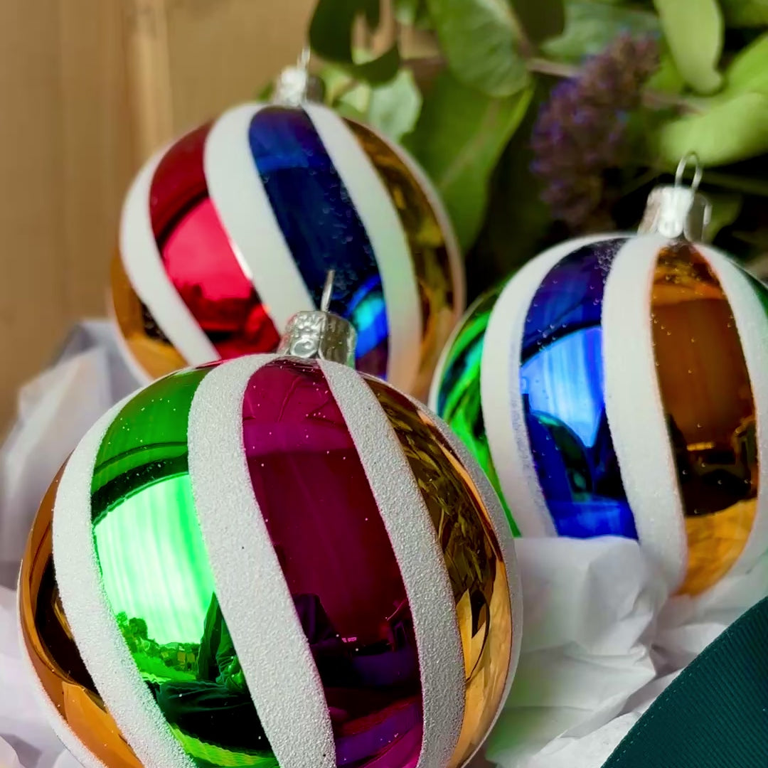 A fabulous set of three large vintage style baubles with a nostalgic candy stripe design. Three baubles of different designs - one red blue gold, one pink green gold, and one blue green gold, each with white glittered stripes.