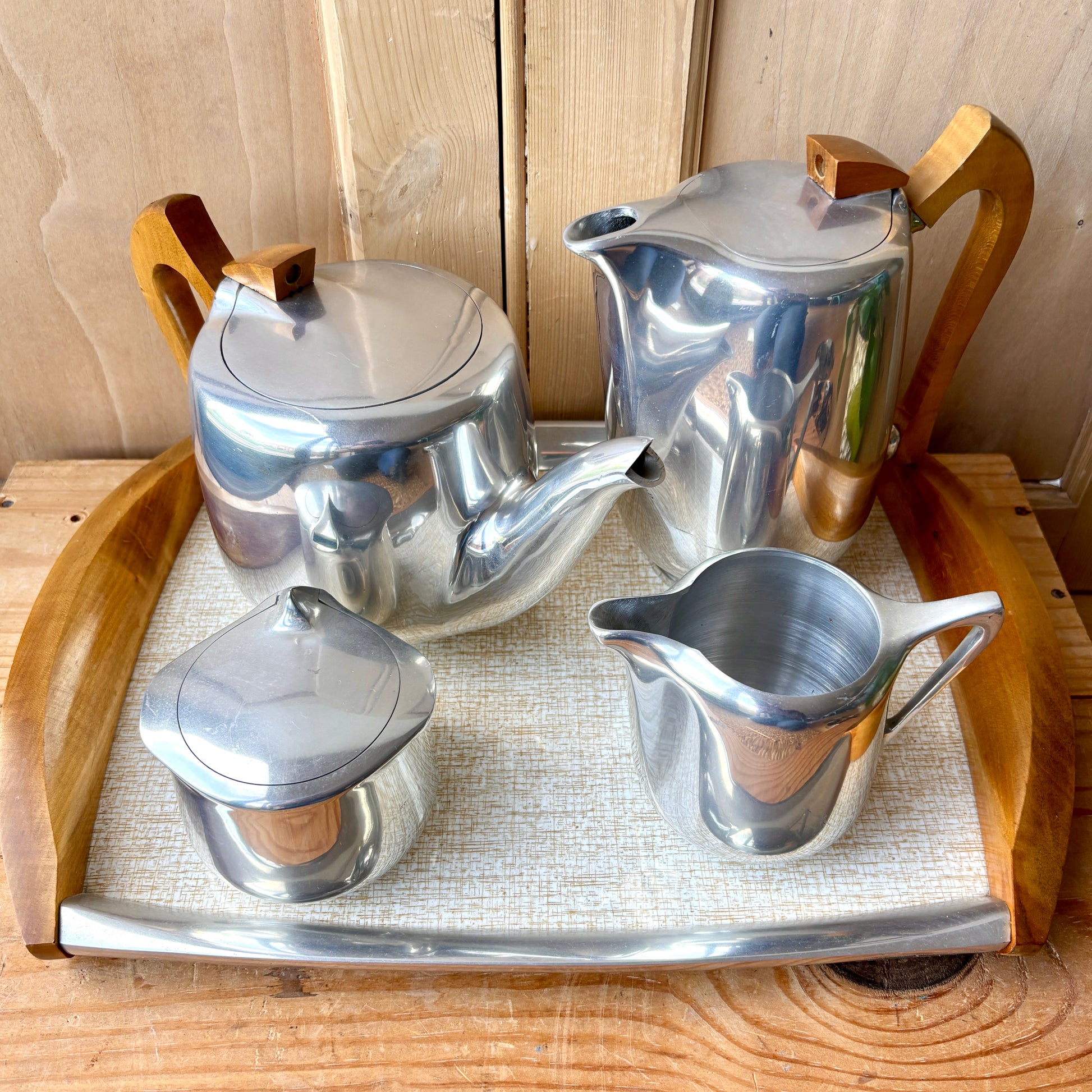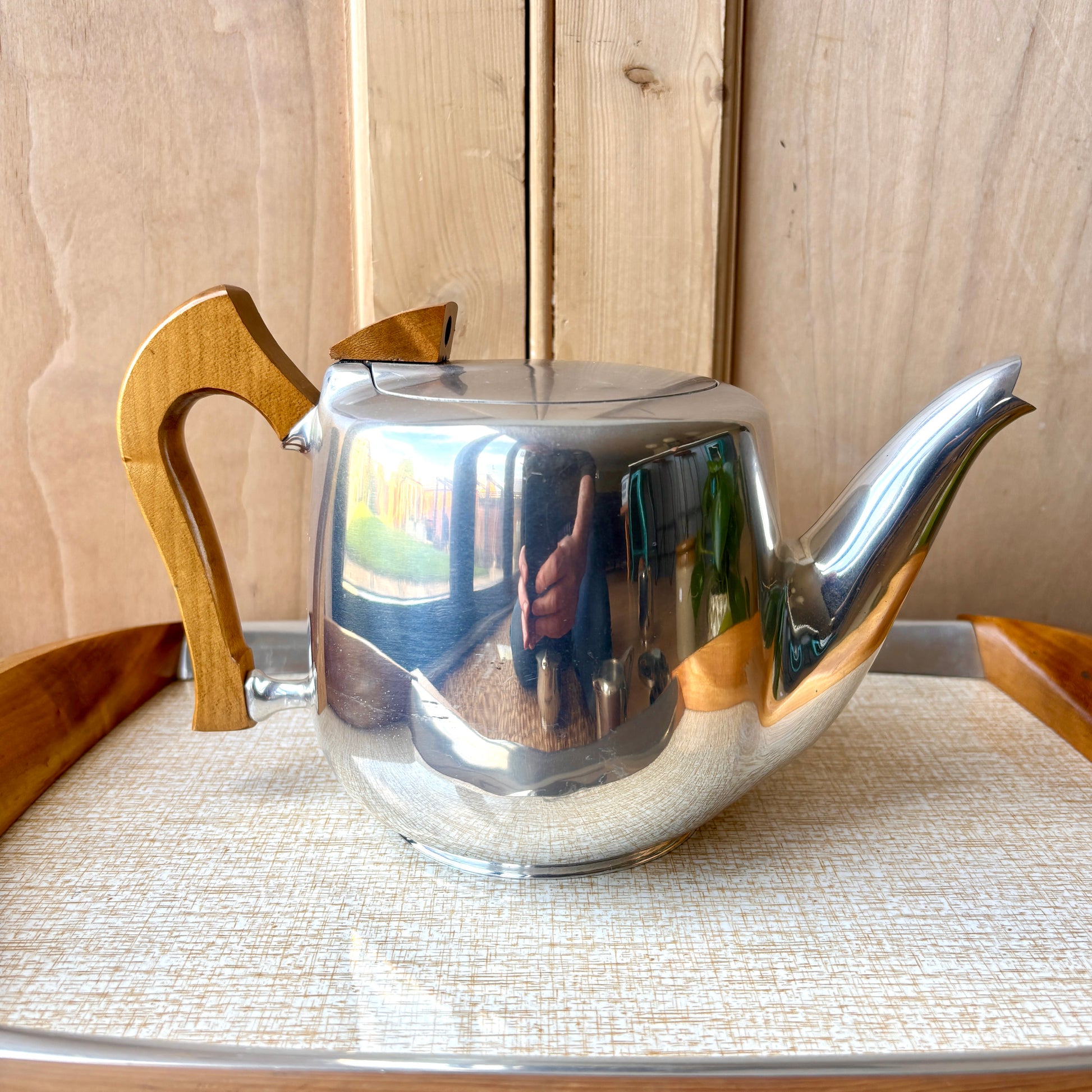 This Superb Piquot ware tea and coffee set dates from the 1950s and boasts the distinctive sycamore wooden handle and lid lifters. It was felt that no plastic could imitate the grain of real wood - and we agree!