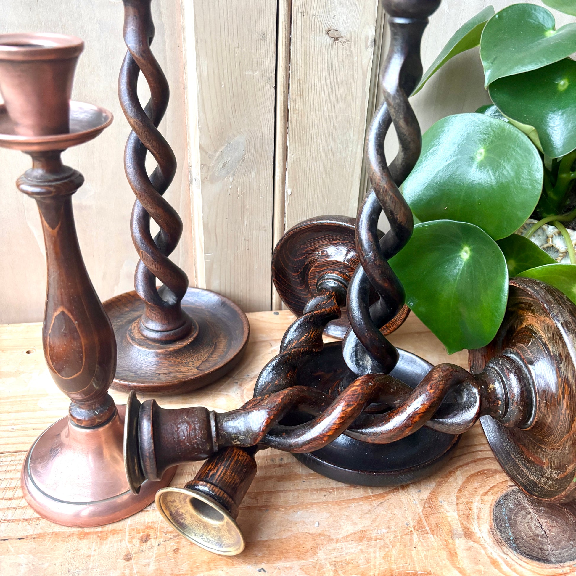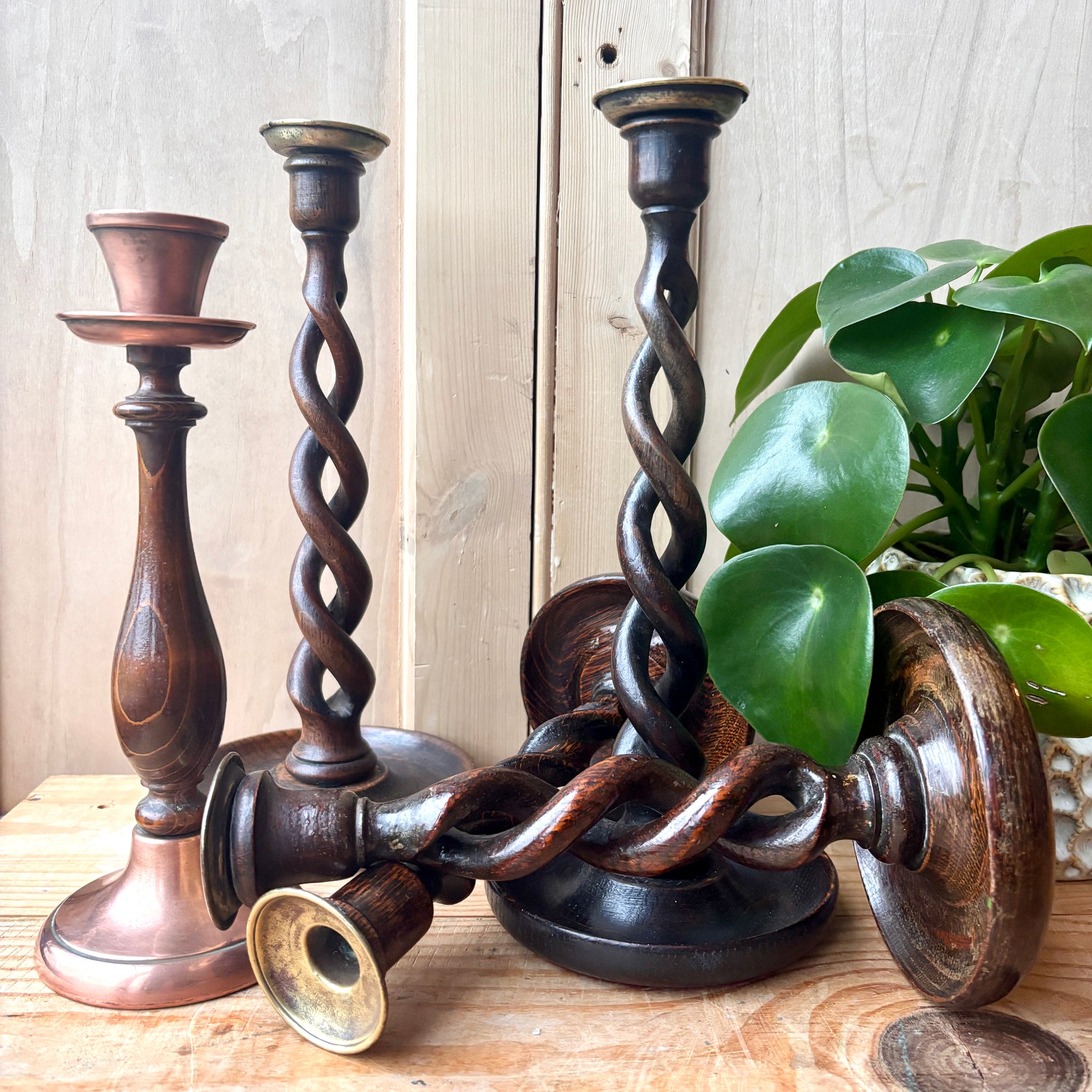 B - Very nice tall open twist Oak candlestick with fabulous patina to the wood and great brass inserts - height 32cm base 14cm