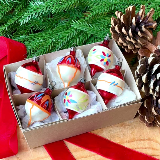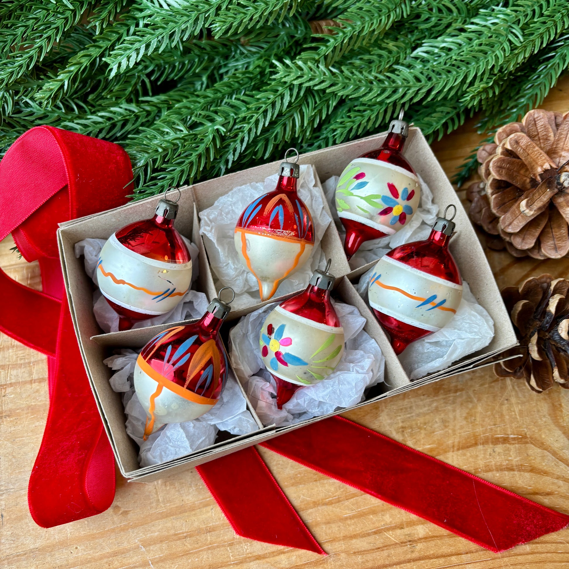 A beautiful collection of six genuine vintage glass baubles, each handpainted with delicate designs and with a lovely pointed shape. Each measures around 3cm across & 5.5cm high in shades of red white, blue and orange.