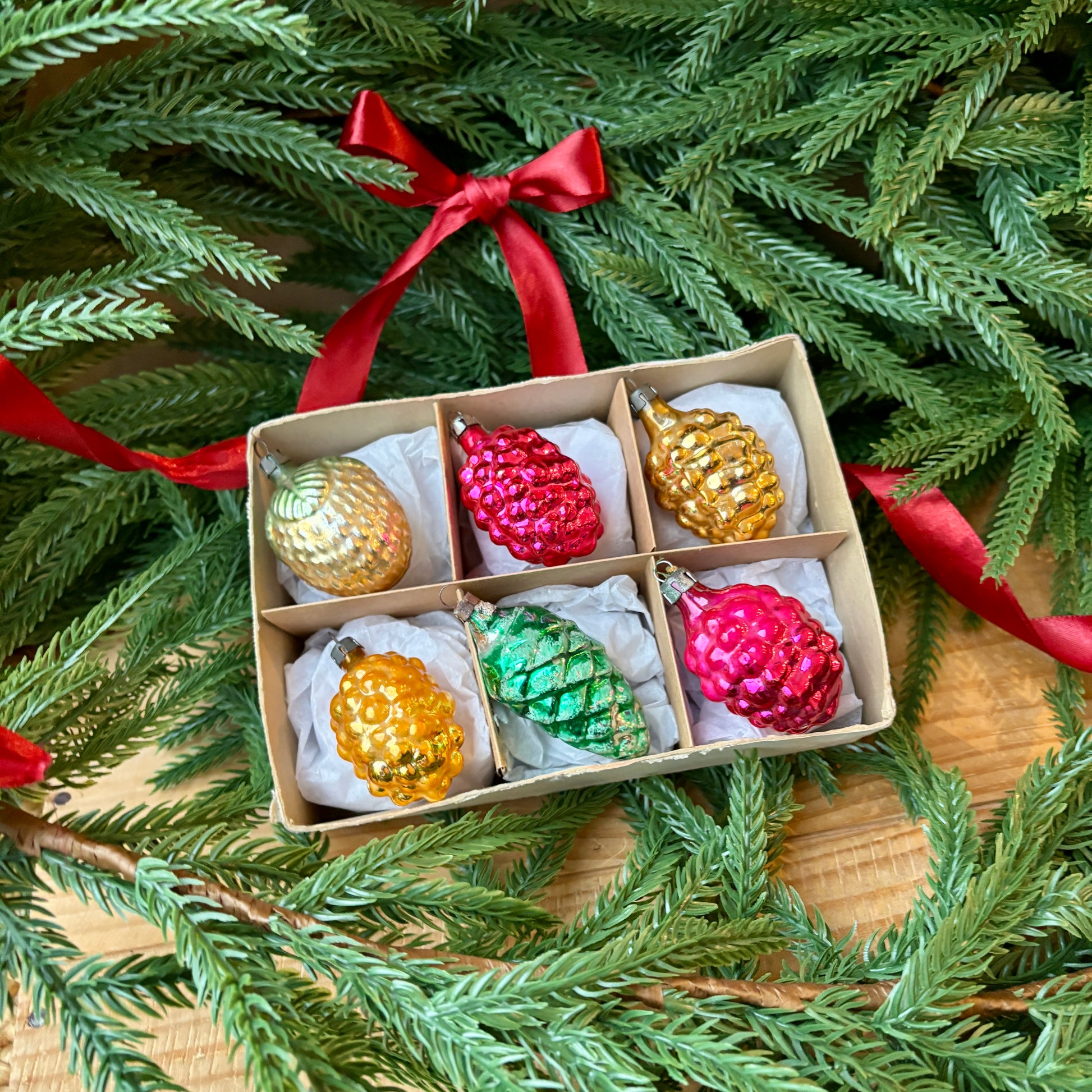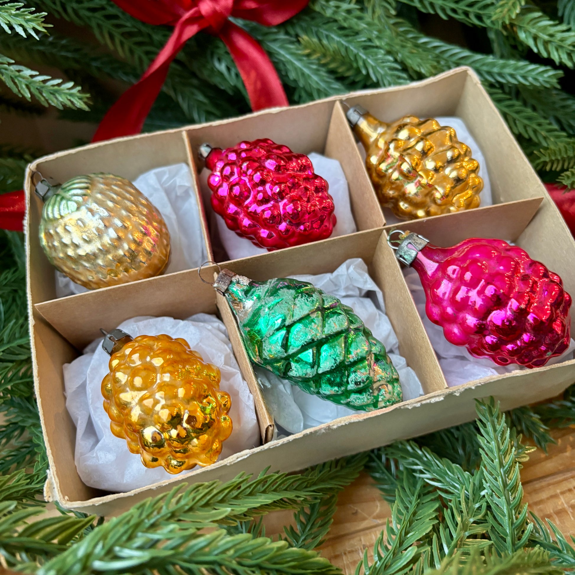A beautiful collection of six genuine vintage glass baubles in the shape of bunches of grapes, pinecones, and a strawberry. These represent some of the very best of the best baubles from those we've collected throughout the year.