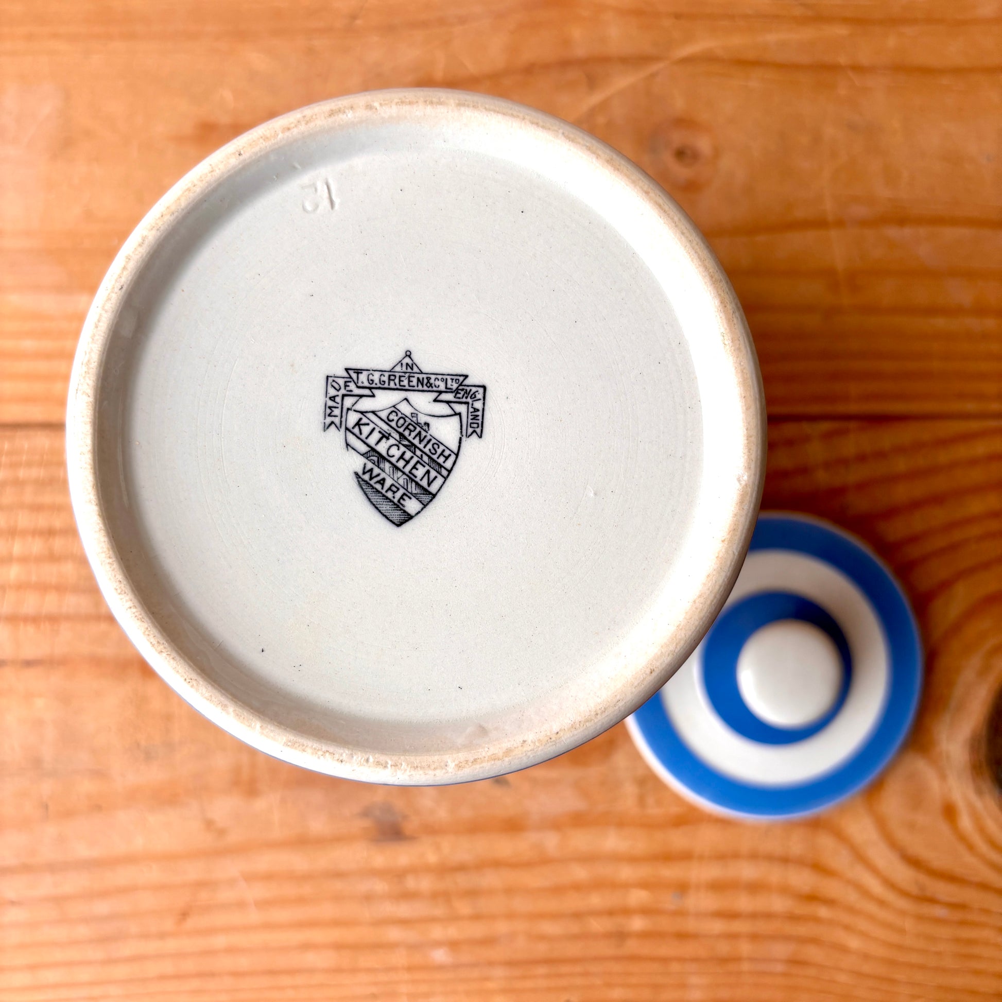 Vintage TG Green Blue & White striped Cornishware Rice canister. The black shield was mainly used for named storage jars like this and dates the piece to between 1930 and 1950s. The font used on this piece makes it one of the earlier examples around 90 years old. the jar is in excellent vintage condition with no chip crazing or cracks there is a small manufacturing blemish on the inside of the neck, please see the images.