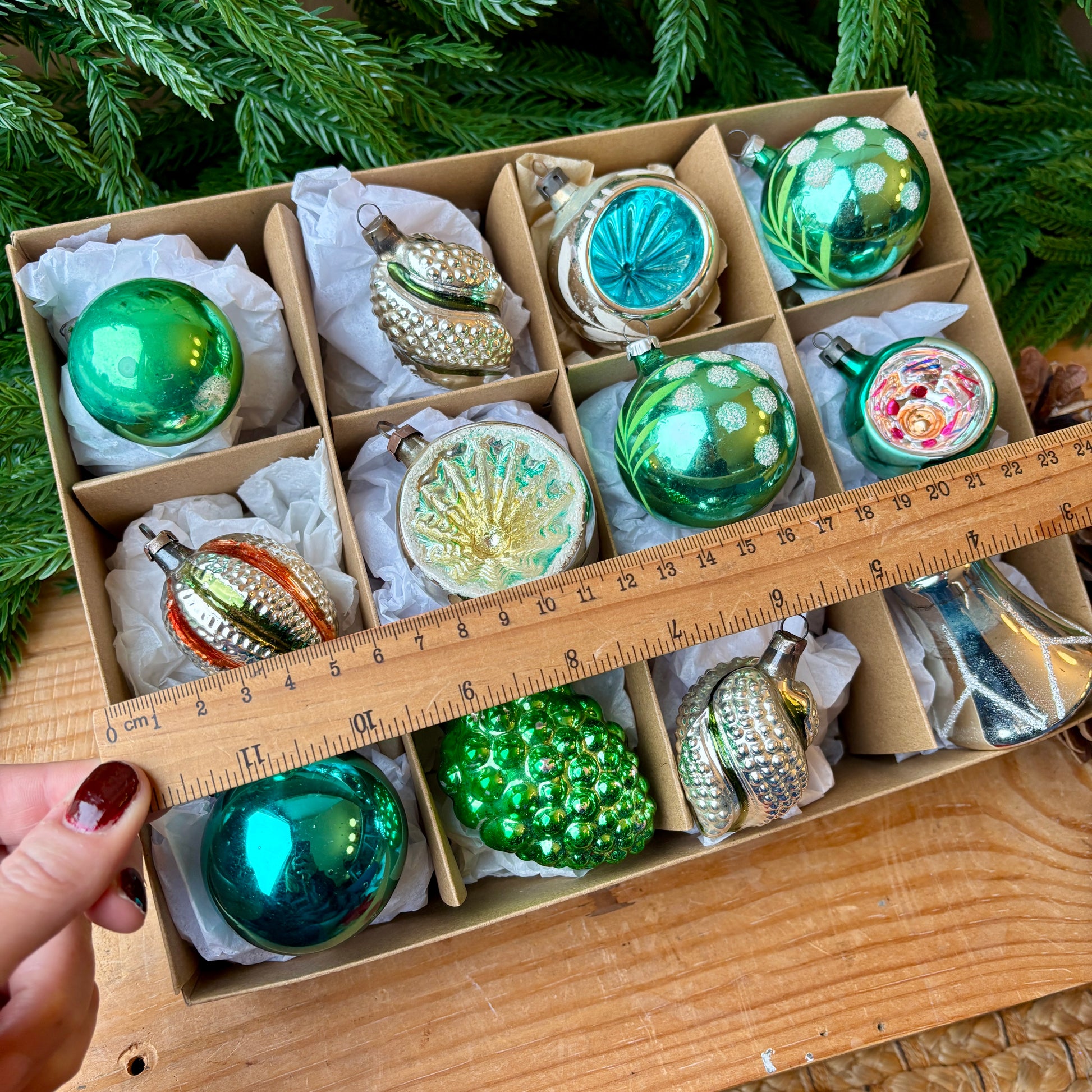 At over 50 years old these baubles have a loved and timeworn appearance. These are in great vintage condition with the signs of age you would expect - beautiful mottling and variation in shade and finish. With these you can add a whimsical nostalgic touch to your tree, or give as a thoughtful gift.