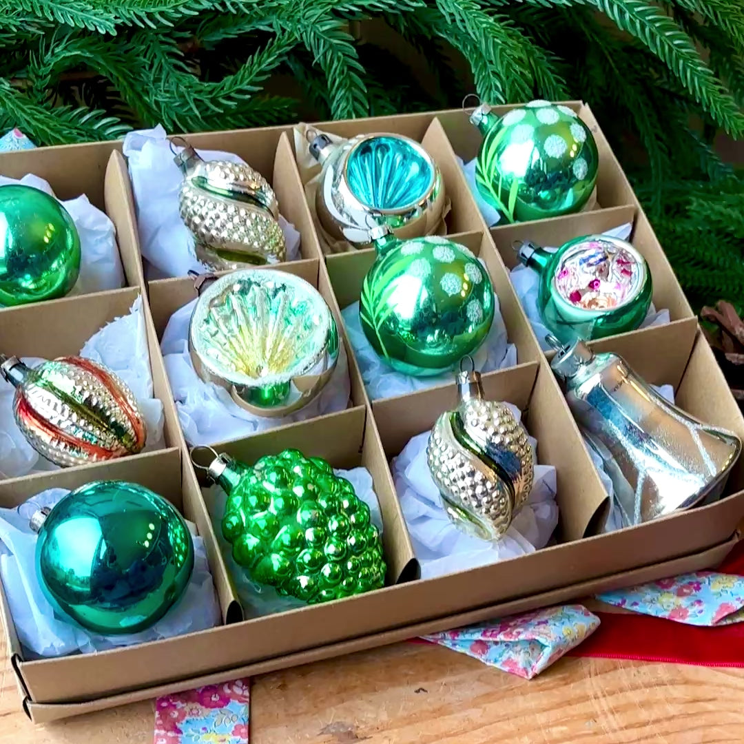 A beautiful collection of 12 genuine vintage glass baubles in minty shades of green, teal and silver with accents of pink and gold. There are a real variety of designs and shapes - droplet, grape, sphere and bell shape. Some have hand painted embellishments, some with delicate concaves.