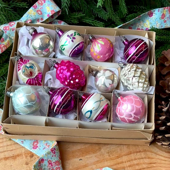 A beautiful collection of 12 genuine small vintage baubles in shades of purple, pink, and silver. There are a real variety of designs and shapes - grapes, sphere, droplet, hand painted and decorated designs, plus one lovely concave bauble. Each measures around 3cm high/across.
