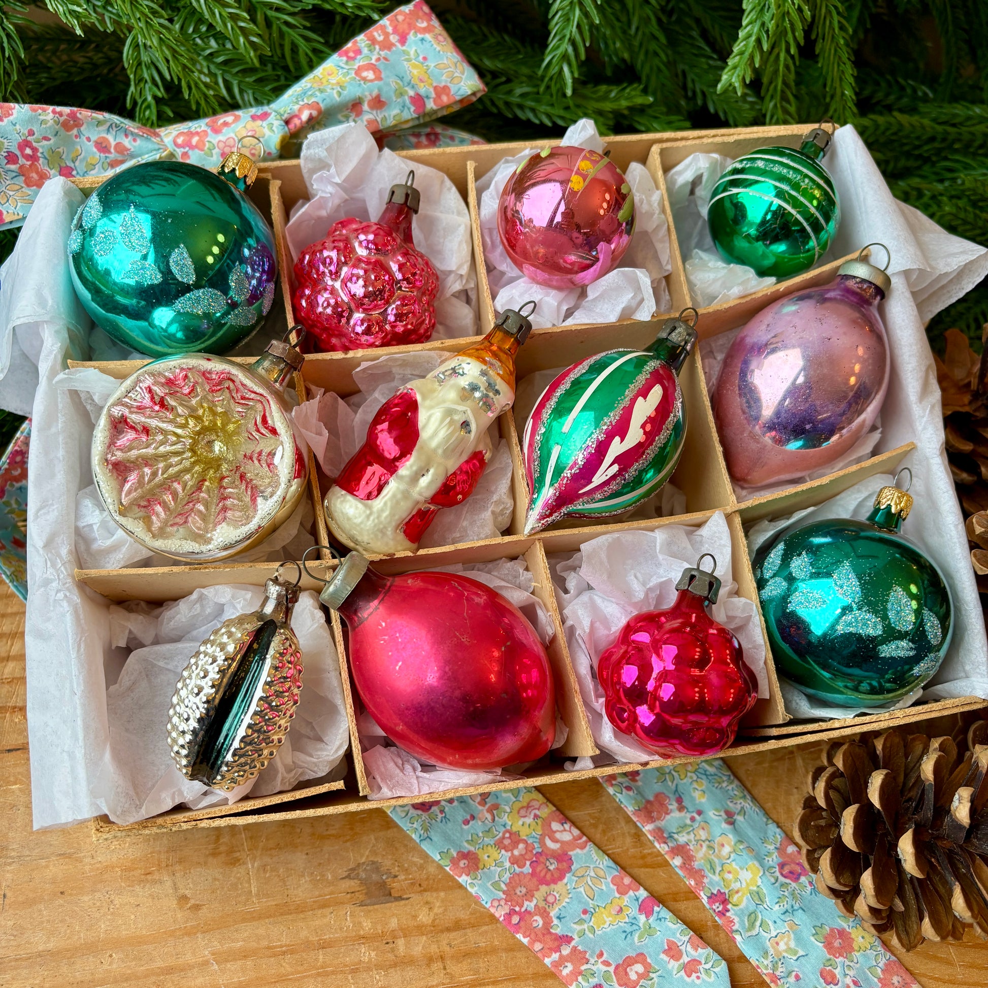 A beautiful collection of 12 genuine vintage glass baubles in shades of green, pink, and silver. There are a real variety of designs and shapes - grape, sphere, droplet, and delicate concave examples, plus a pink-coated Father Christmas with a gold hat. Some have been hand painted, and some have early glitter/ mica embellishments.
