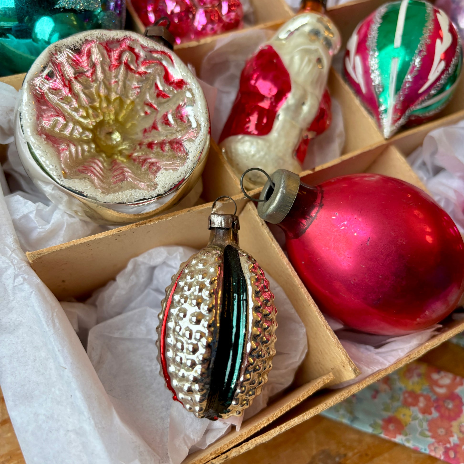 At over 50 years old these baubles have a loved and timeworn appearance. These are in great vintage condition with the signs of age you would expect - beautiful mottling and variation in shade and finish. With these you can add a whimsical nostalgic touch to your tree, or give as a thoughtful gift.