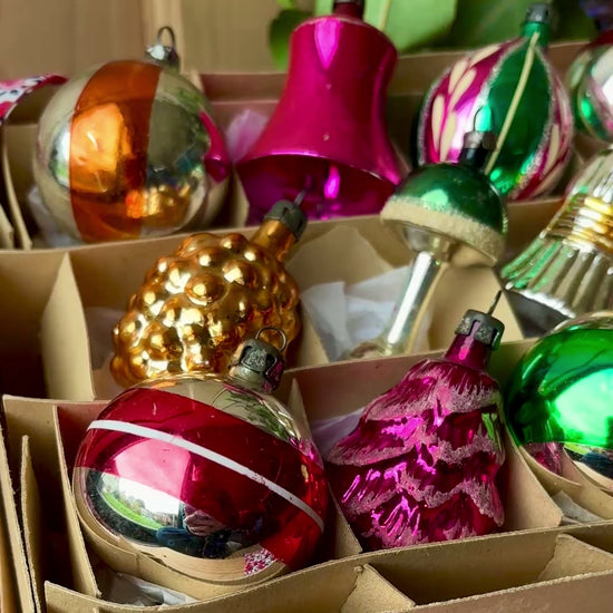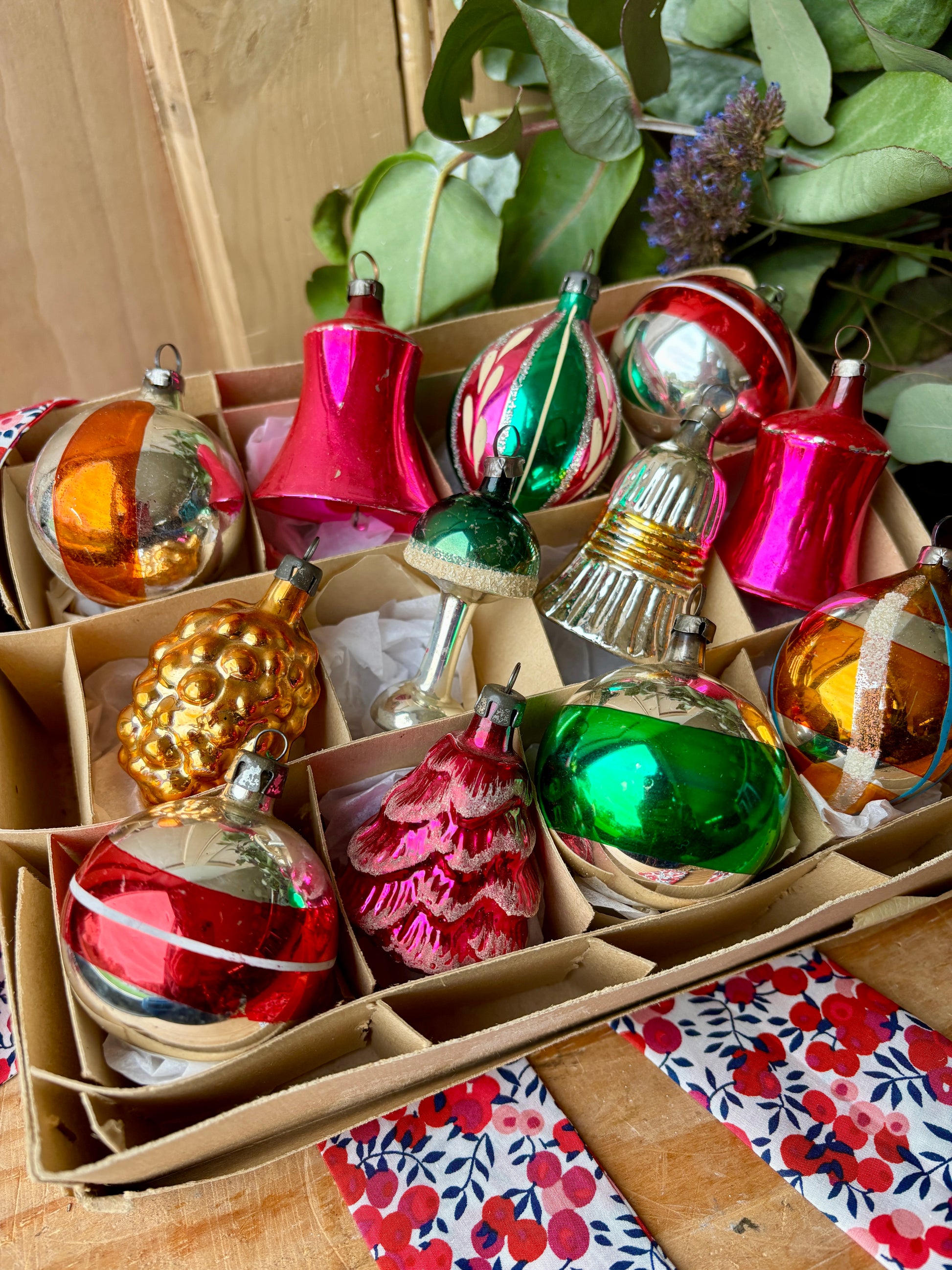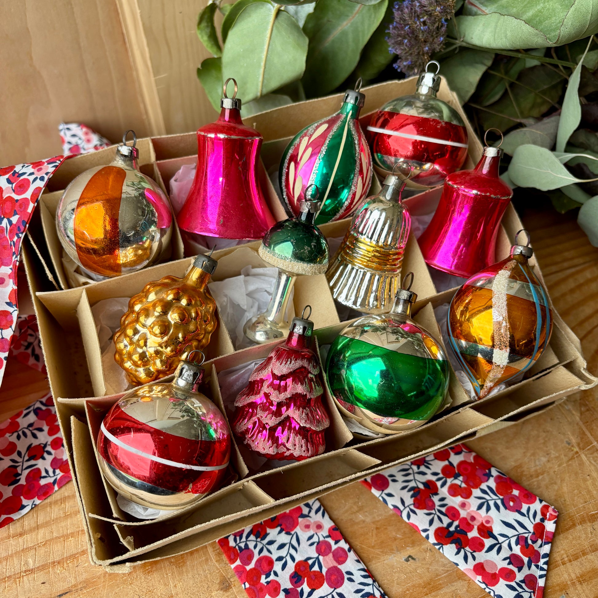 A beautiful collection of 12 genuine vintage glass baubles in shades of pink, silver, red, green, and gold. There are a real variety of shapes and textures - bells - complete with tinkling sound - trees, droplets, ball and one unique mushroom. At over 50 years old these baubles have a loved and timeworn appearance. These are in great vintage condition with the signs of age you would expect - beautiful mottling and variation in shade and finish. Add add a whimsical touch to your tree, or give as a thoughtful gift.