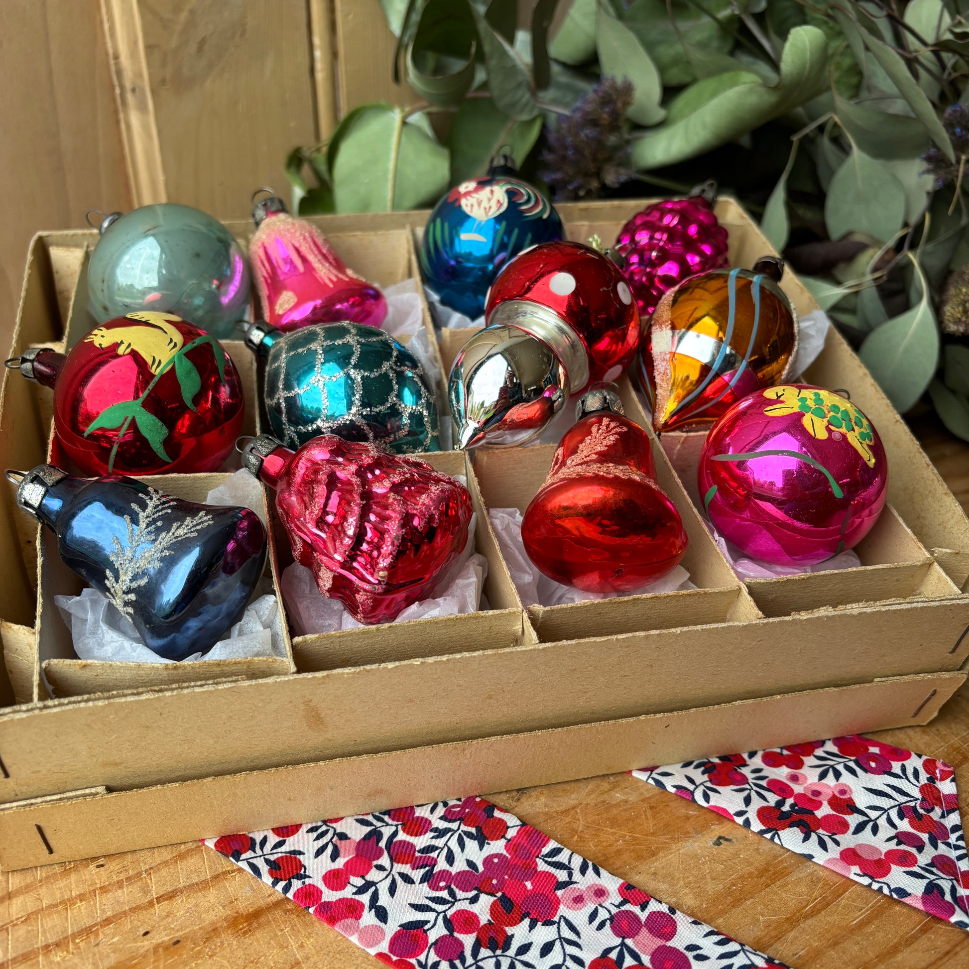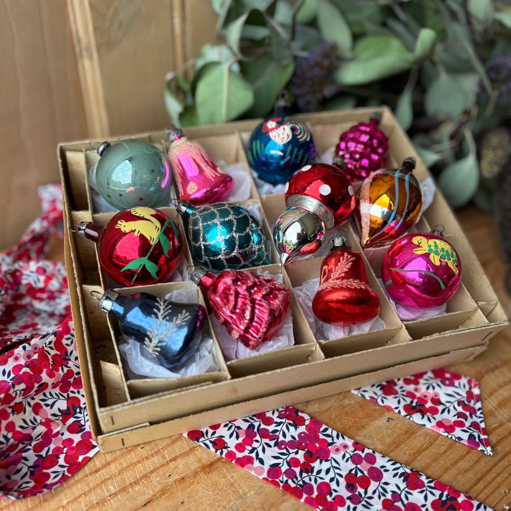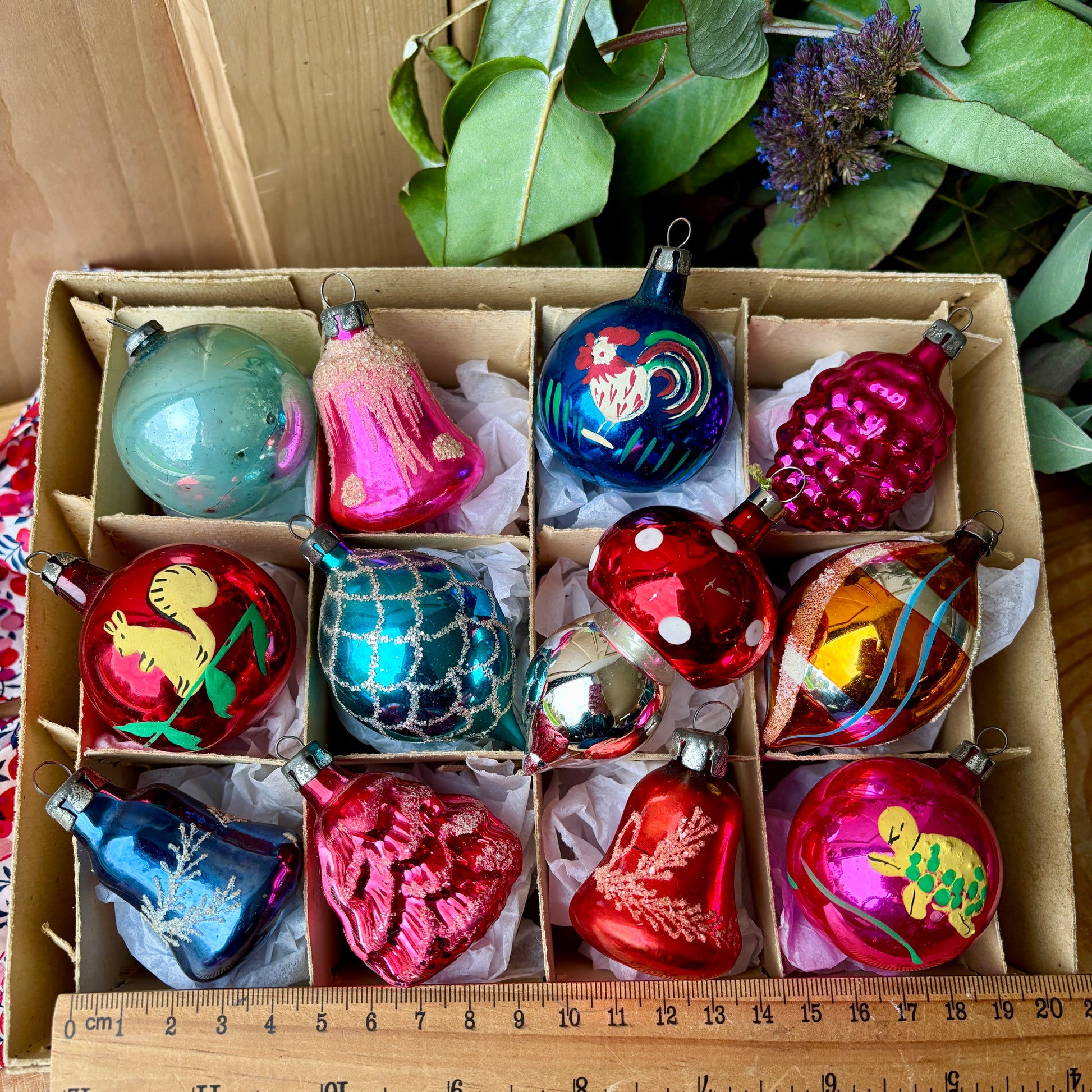 A beautiful collection of 12 genuine vintage glass baubles in shades of pink, red, blue, and gold. There are a real variety of designs and shapes - droplet, grape, sphere and bell shape. Some have handpainted embellishments, and three have beautiful animal designs with squirrel, tortoise and cockerel (we think these are French but can't be sure). One is a cute-as-a-button mushroom. At over 50 years old these baubles have a loved and timeworn appearance. These are in great vintage condition with the signs of age you would expect - beautiful mottling and variation in shade and finish. With these you can add a whimsical nostalgic touch to your tree, or give as a thoughtful gift.