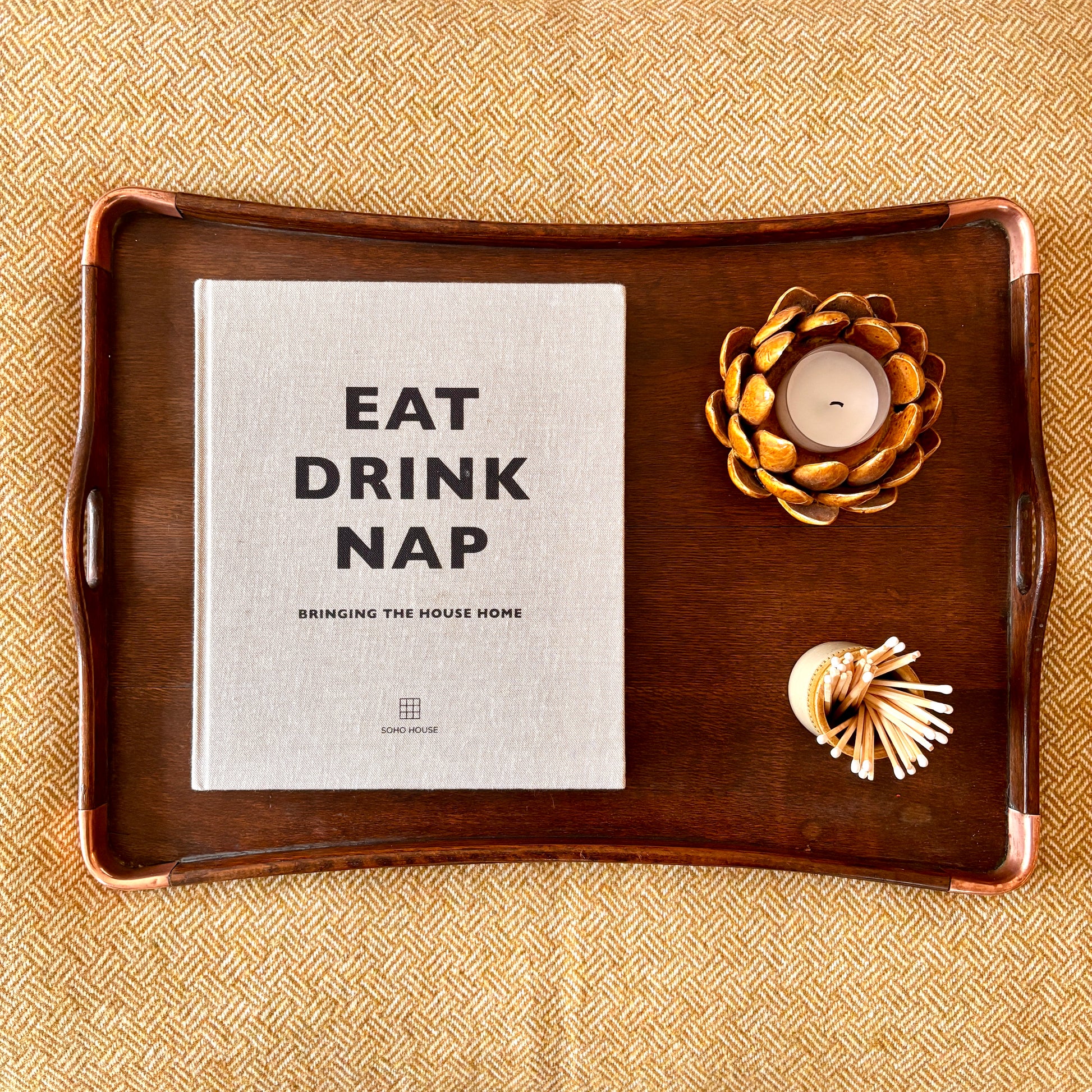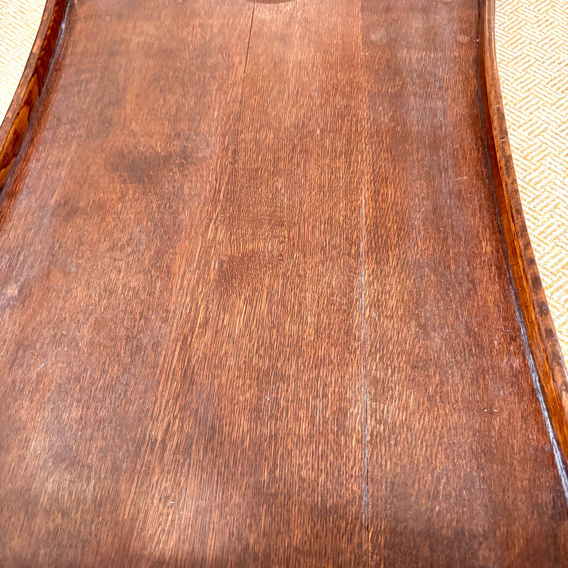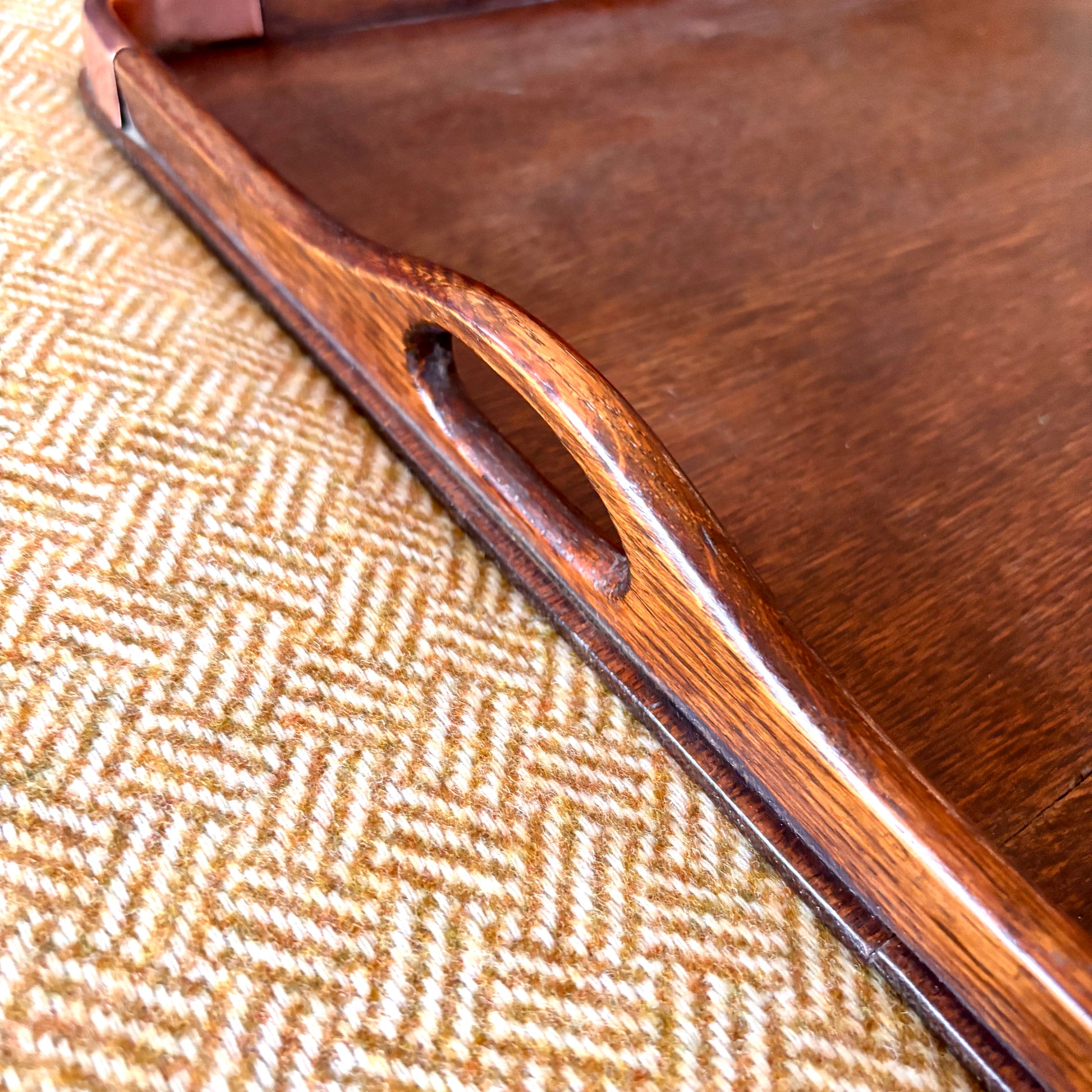 This lovely curved rectangular hard wood arts and crafts style tray dating from approx. 1920s. with nice internal handles and brass capped corners, this tray would grace any living area, bedroom, garden or footstool.