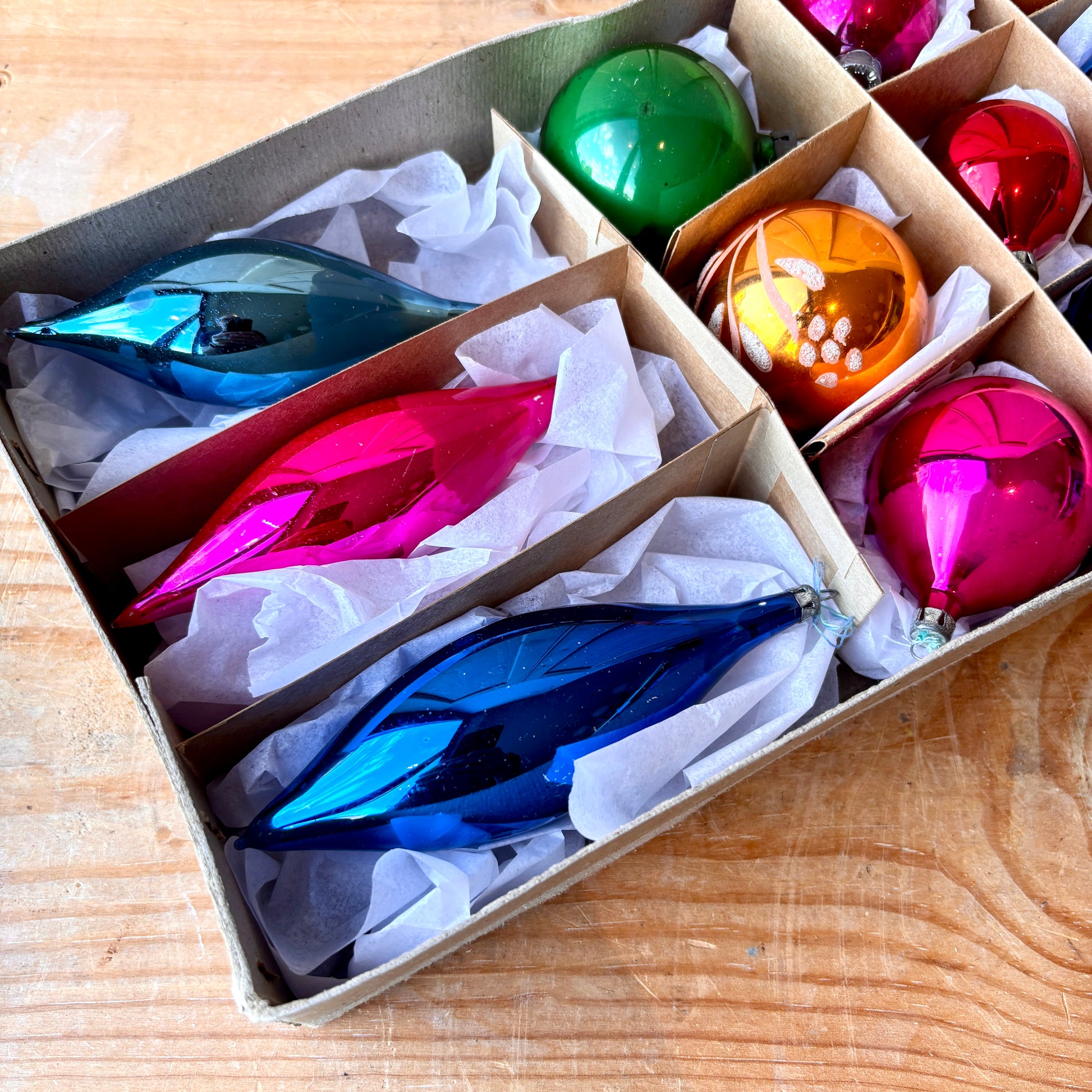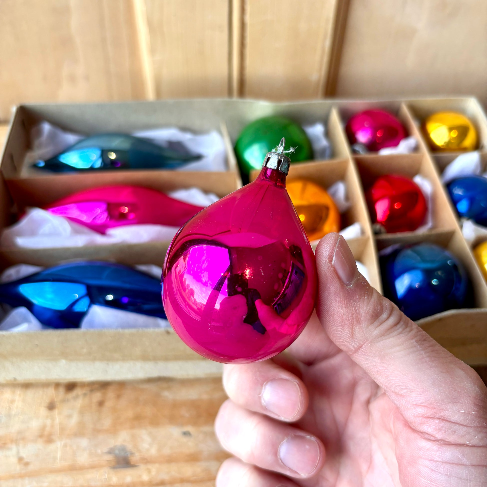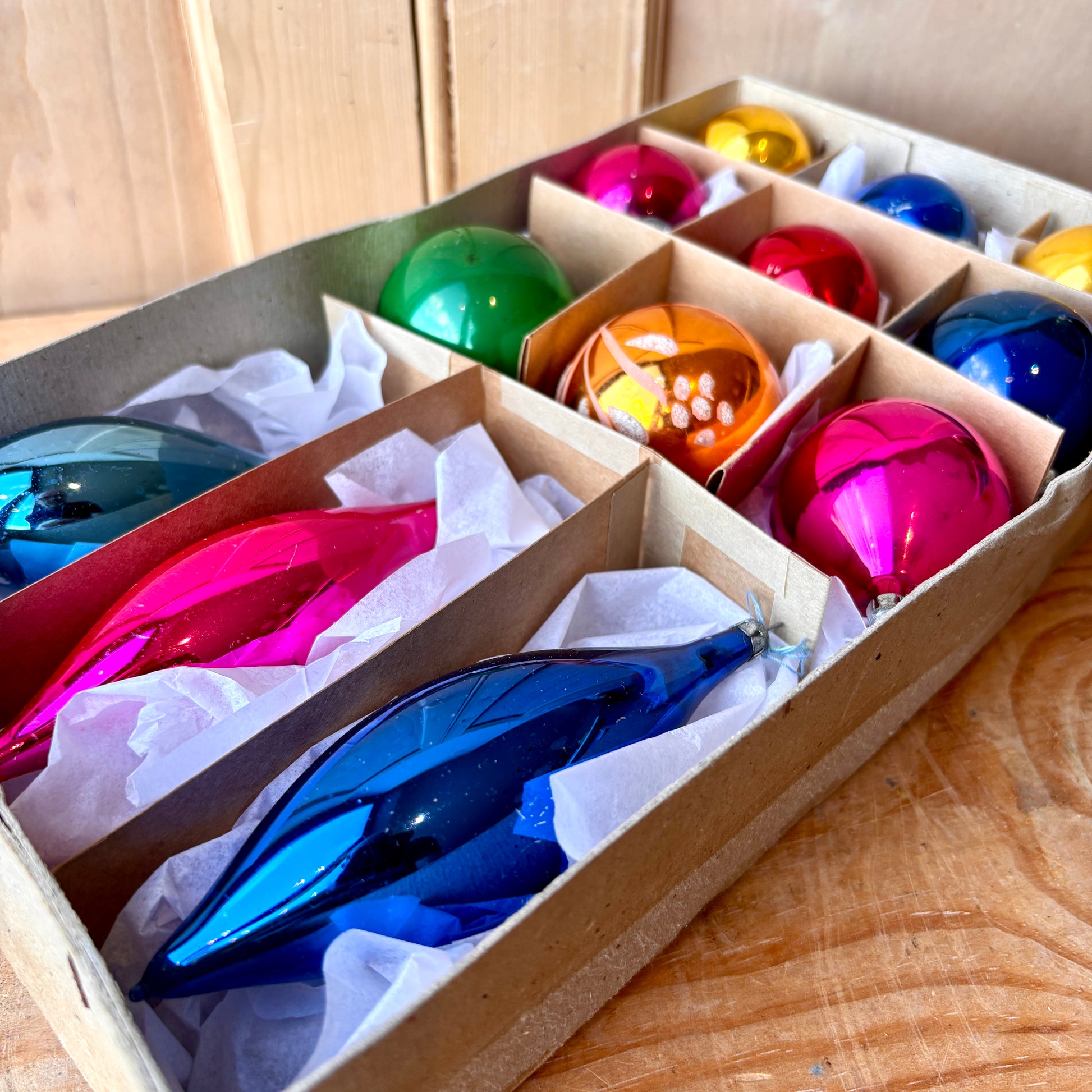 A lovely collection of 12 beautiful vintage glass baubles. Three are long droplets. All in bright colours red, gold, blue pink and green.