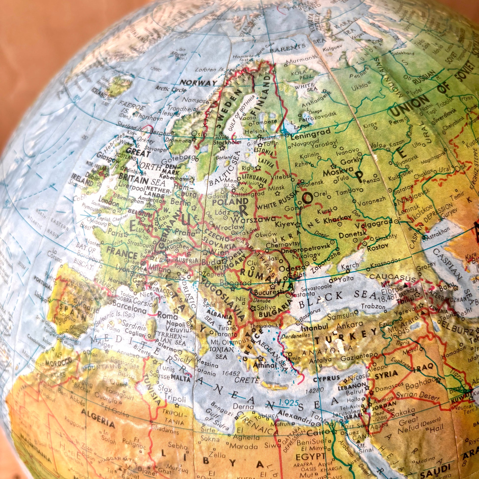 This wonderful vintage Danish globe is a real stunner, fitted on a hexagonal plastic base and chrome bracket. The globes still rotates very smoothly the globe has a dimeter of 30cm so is larger then the average and looks fantastic on a bookcase or desk and would make a perfect gift.