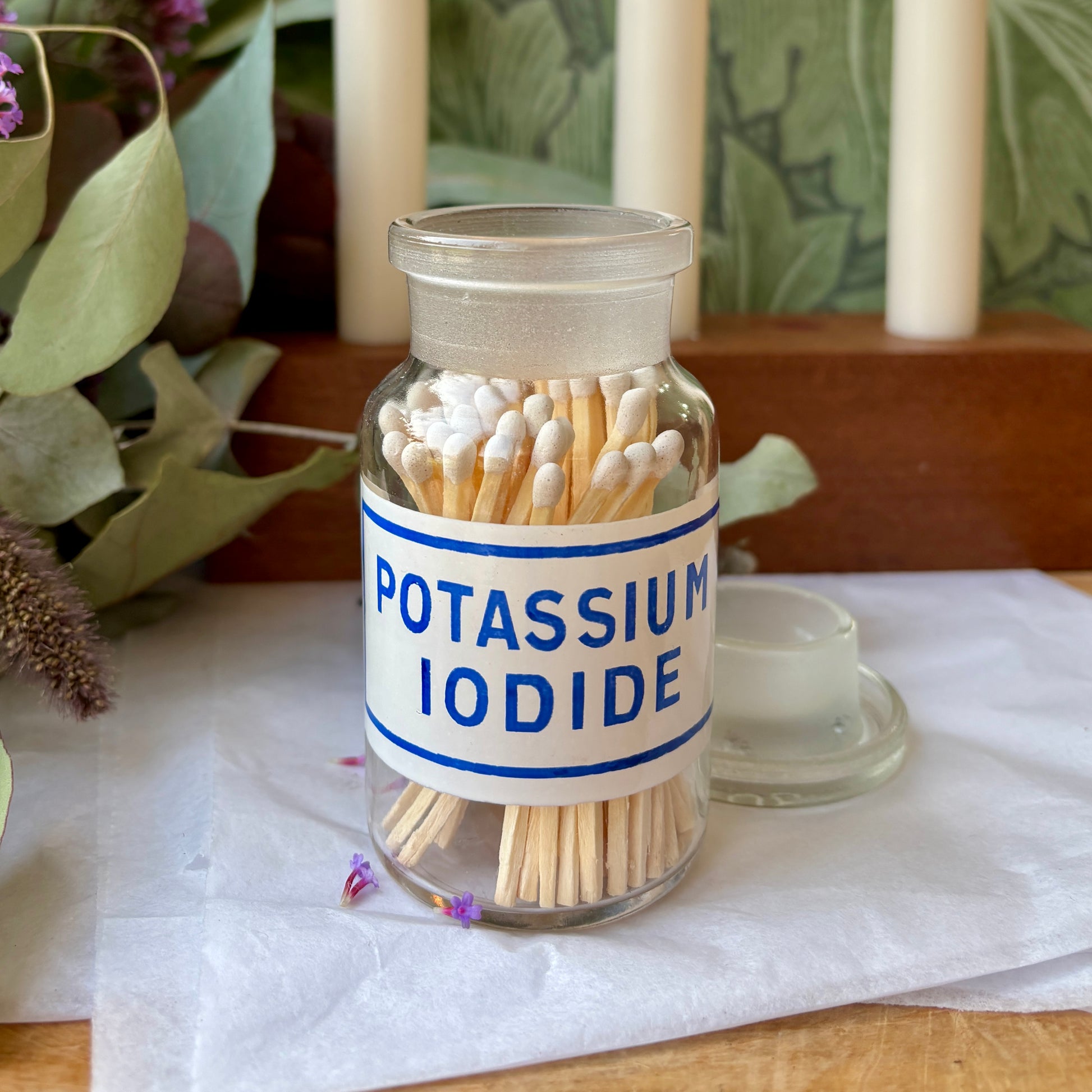 These vintage clear glass lab/chemist bottle match holders with embossed painted labels and strikers to the base are the perfect gift. The glass stoppers have been ground to provide an effective seal. These will really add a bit style and look great on a coffee table. Each chemist bottle comes complete with luxury white tipped matches and spare striker.