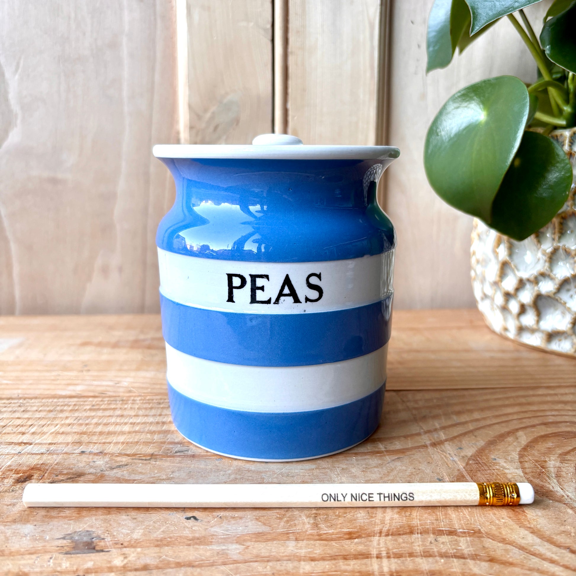 Vintage TG Green Blue & White striped Cornishware "Peas" canister. The black shield was mainly used for named storage jars like this and dates the piece to between 1930 and 1950s. The font used on this piece makes it one of the earlier examples around 90 years old. the jar is in excellent vintage condition with no chip cracks or crazing, there is a small manufacturing flaw on the inside of the neck, please see the images.