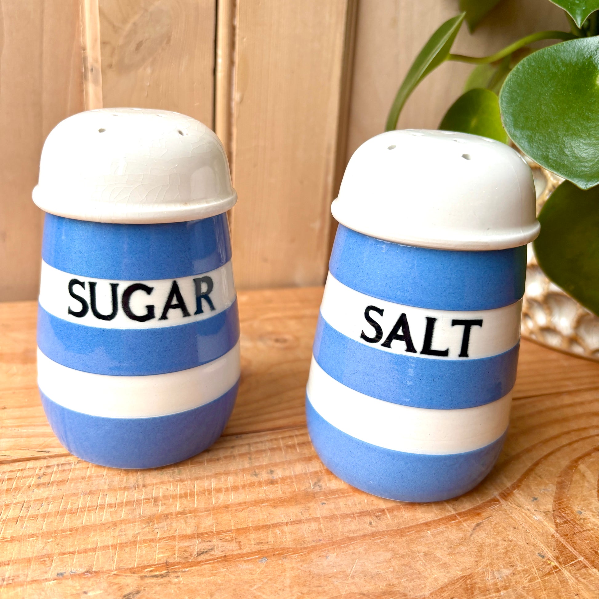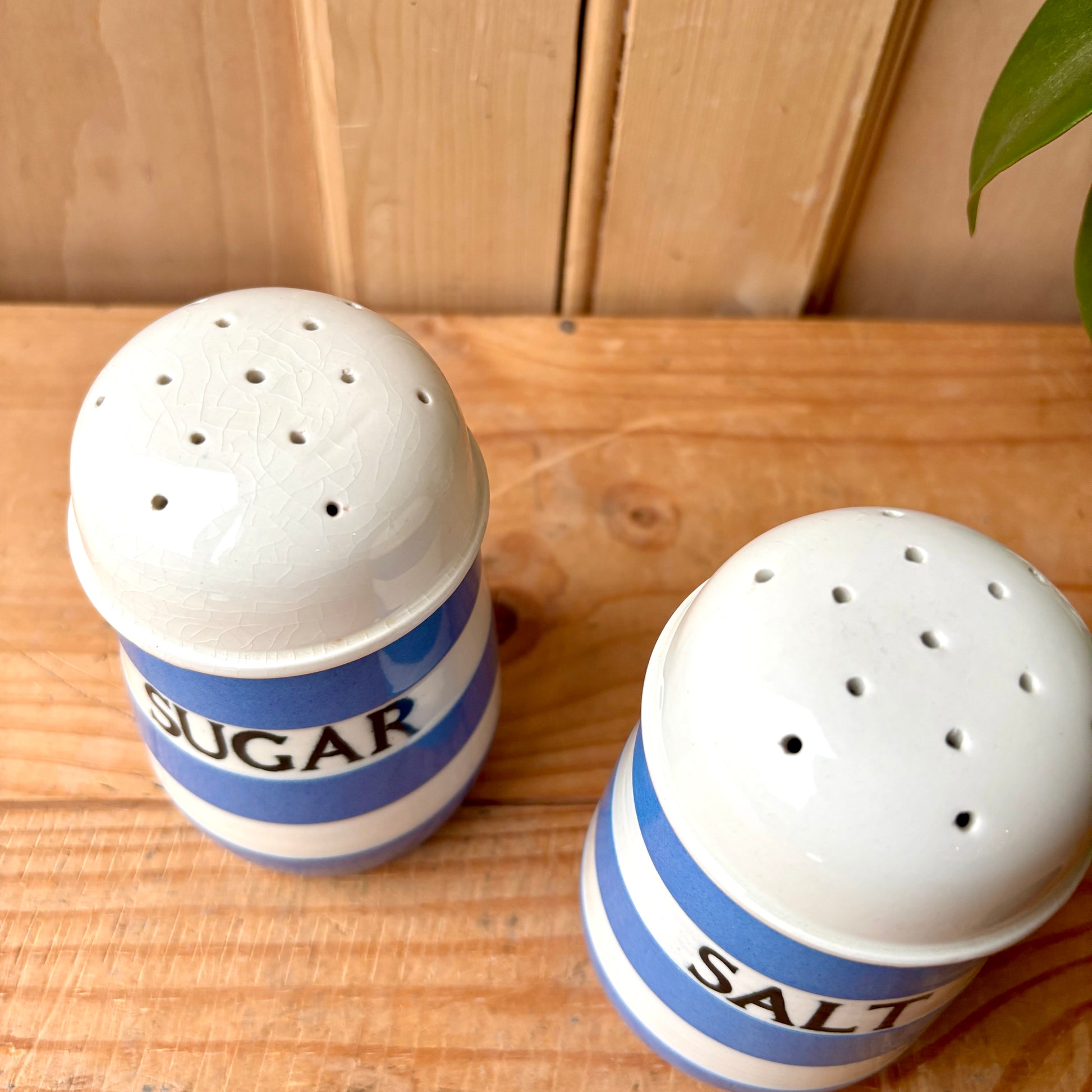 Vintage TG Green Blue & White striped Cornishware sugar shaker (A) and salt shaker (B). The green shield was mainly used for named storage jars like this and dates the piece to between 1930 and 1950s. The font used on this piece makes it one of the earlier examples around 90 years old.